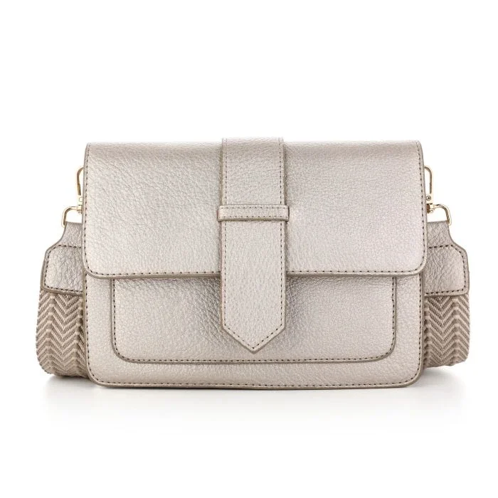 Deze stijlvolle goudkleurige crossbody tas geeft elke outfit een warme, luxe uitstraling. Het strakke design met de opvallende sluiting en het geweven detail aan de zijkanten zorgen voor een chique en moderne look. Compact maar praktisch voor al je essentials.