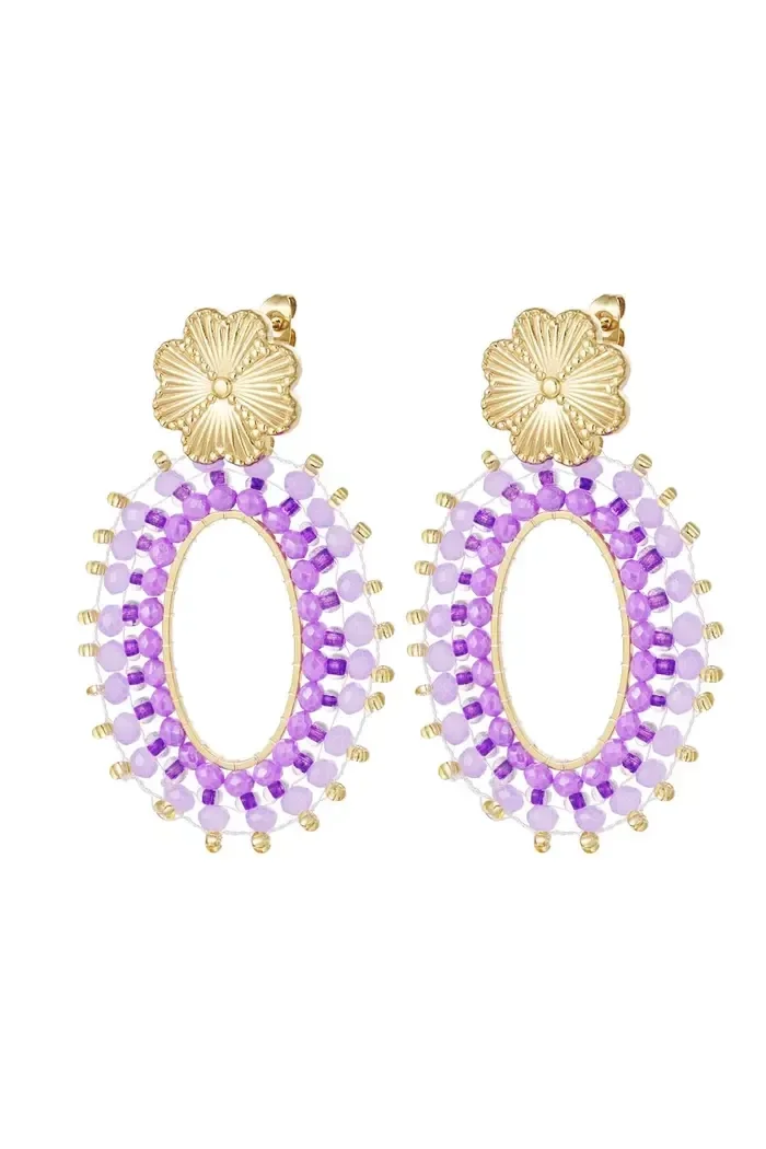Statement oorbellen met een klaver en kraaltjes in de kleur lila.